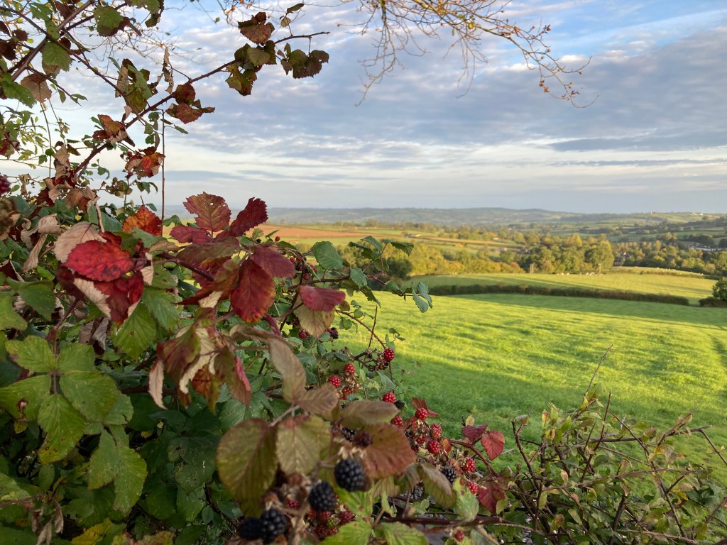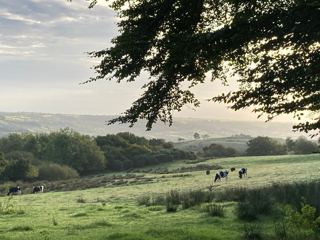 Up on the hill this morning, there is a stillness in the trees. I look out on the view across farmland and also to the sea.