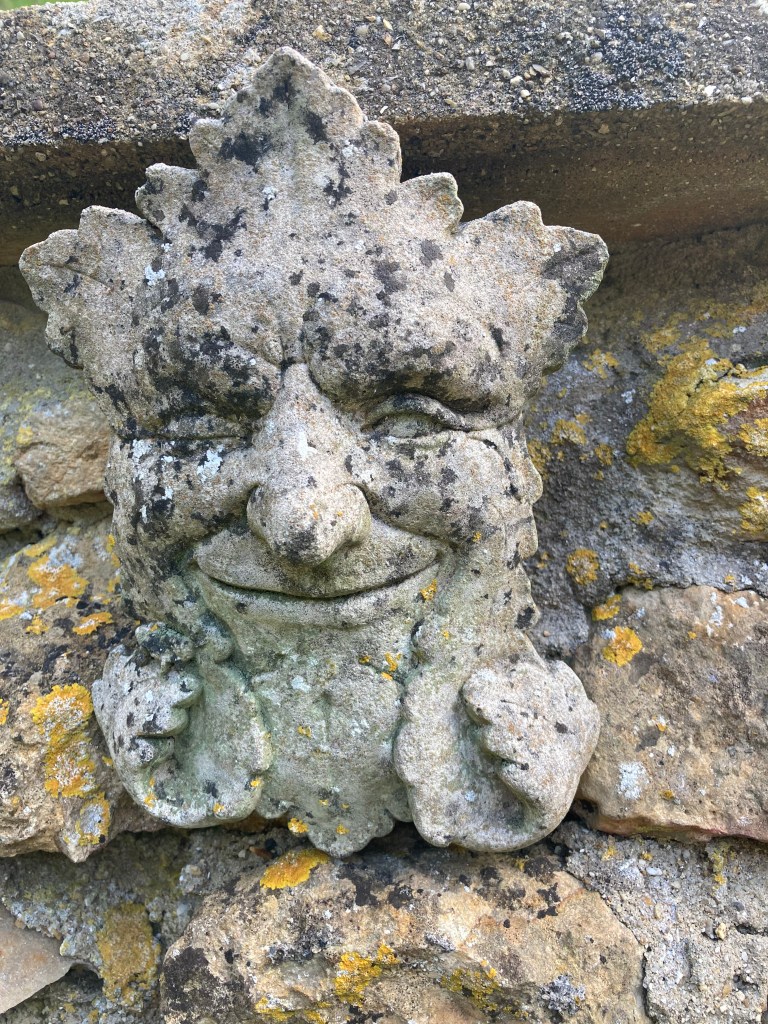 I love the way that stone – even reproduction stuff – weathers and how it looks against the colours and textures of blotchy yellow lichens, luxuriant green moss and glossy ivy.